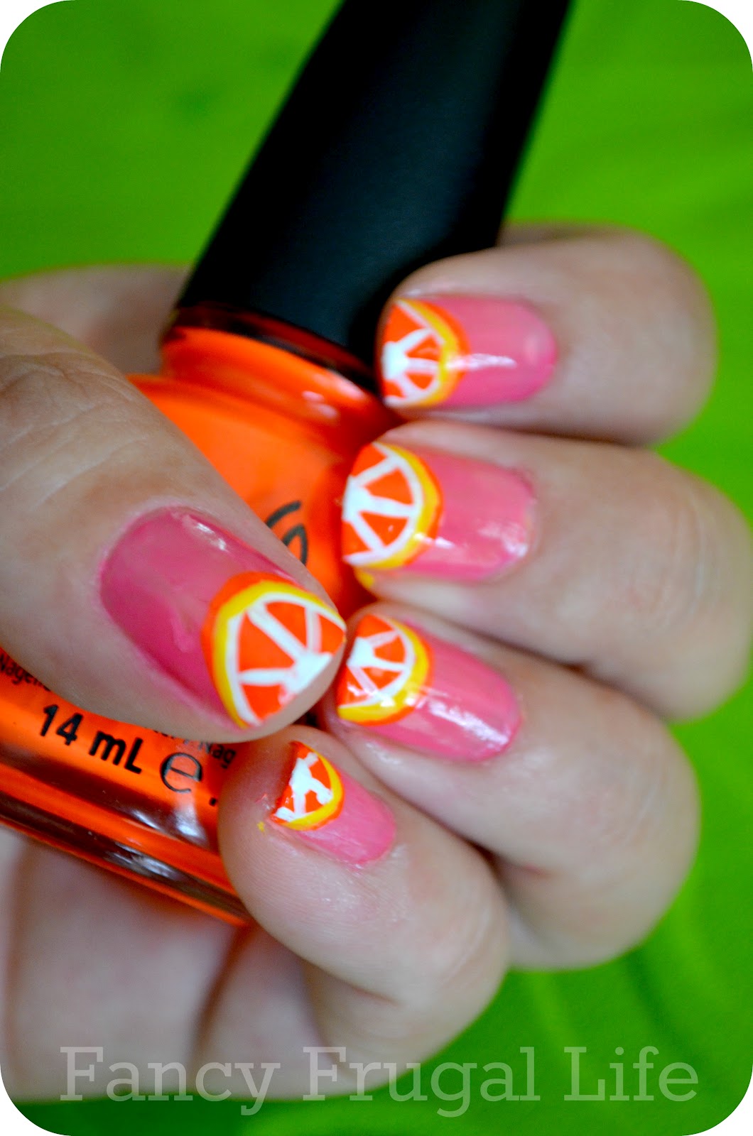 Just showed my BG this tutorial after doing watermelons on her nails and she loved it! We were just thinking if you paint the nail orange and the rounded corner orange, you'd have pink grapefruit. Thanks for the ideas you just made our weekly nail time more fun! :-) *high five*